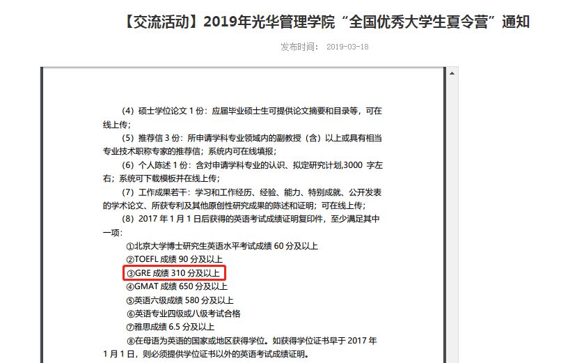 例如在申请参加光华管理学院优秀大学生夏令营时,如果正好考取了GRE且成绩不错,可以将GRE成绩单作为英语证明材料同时提交,为成功申请夏令营做一些保障。